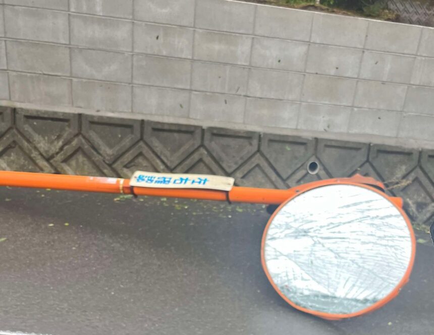 近隣の小学校の鉄の門扉は風によって倒されておりました。