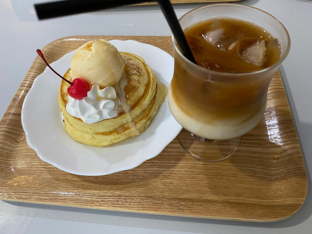 パンケーキ2枚にアイスーにキャラメルティー🫖