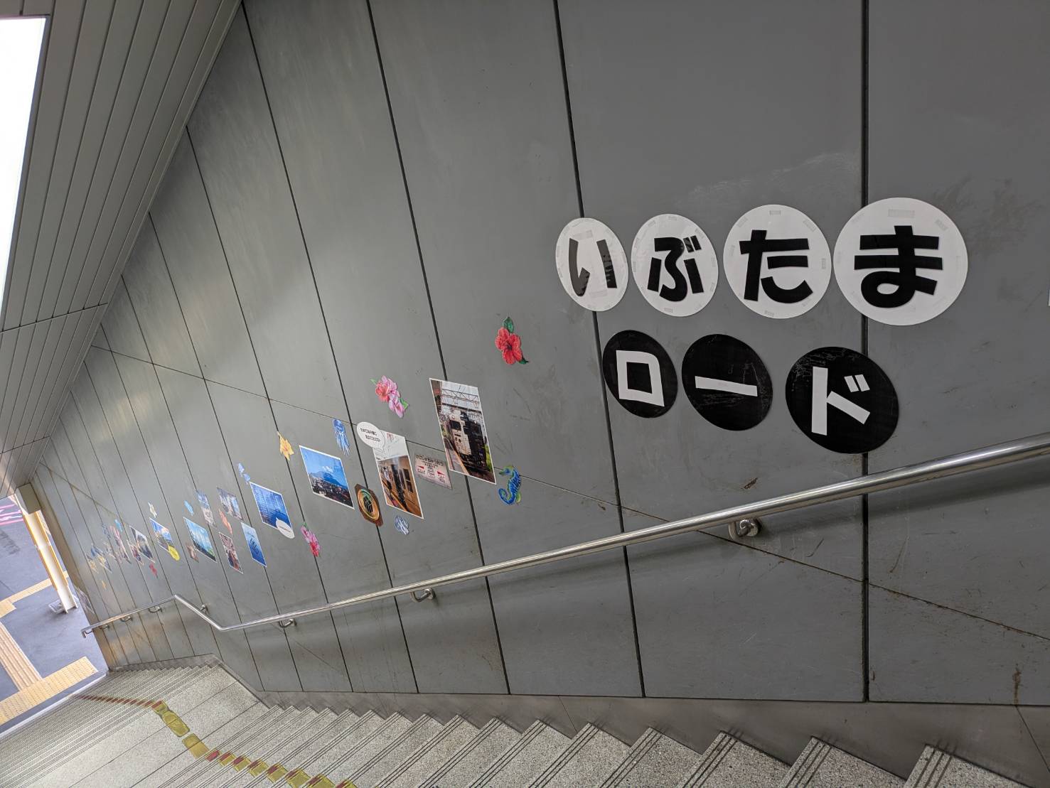 改札口からホームへ下る階段は『いぶたまロード』でいぶたま号の紹介写真が並んでいます。
