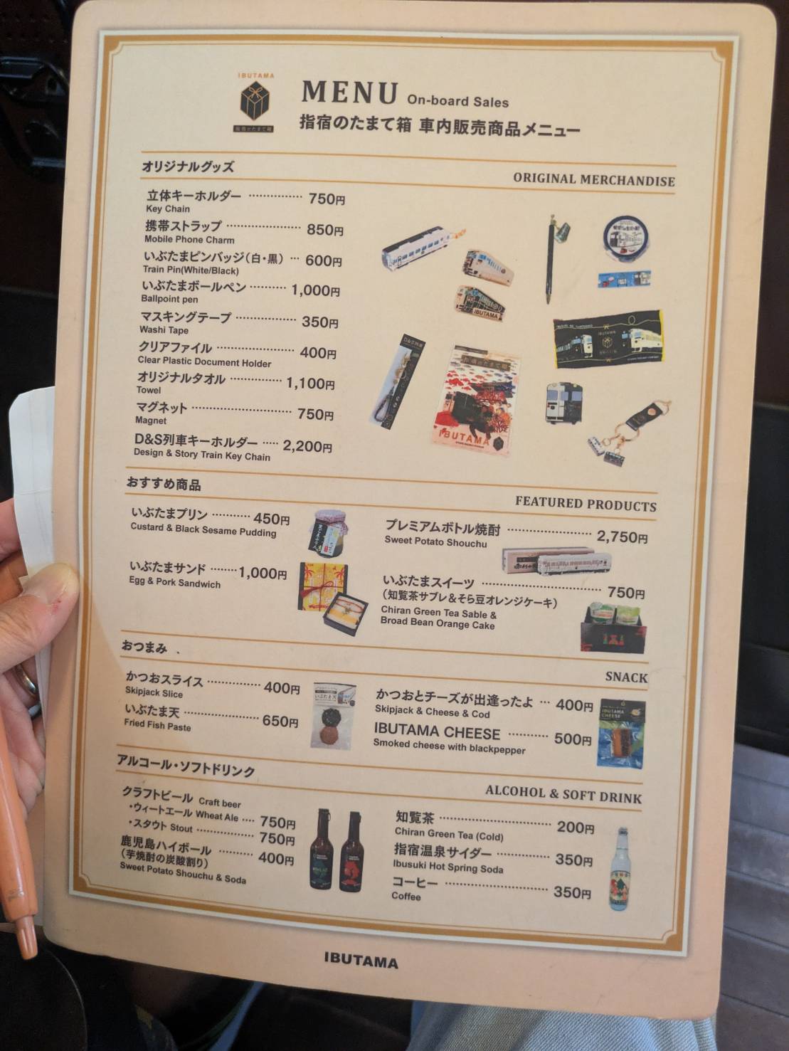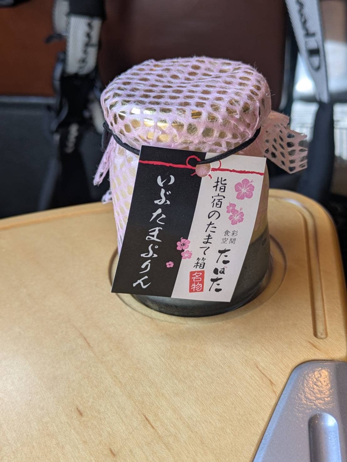 出発すると、ワゴンサービスが回ってくる前に、メニューを配られます。お土産からスイーツまでいろいろあり、名物いぶたまプリンを食べました。