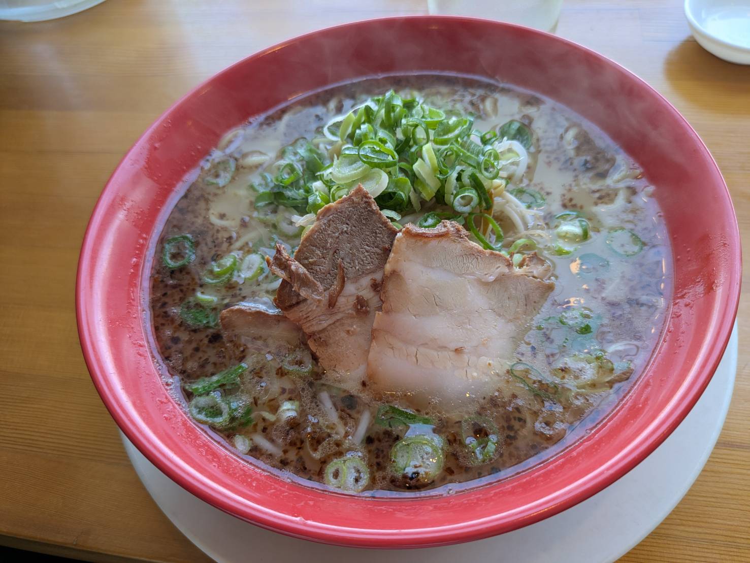息子は、あっさり豚骨ラーメン(赤いどんぶり)を、私は、特製焦がし豚骨かさね味(黒いどんぶり)を食べました。