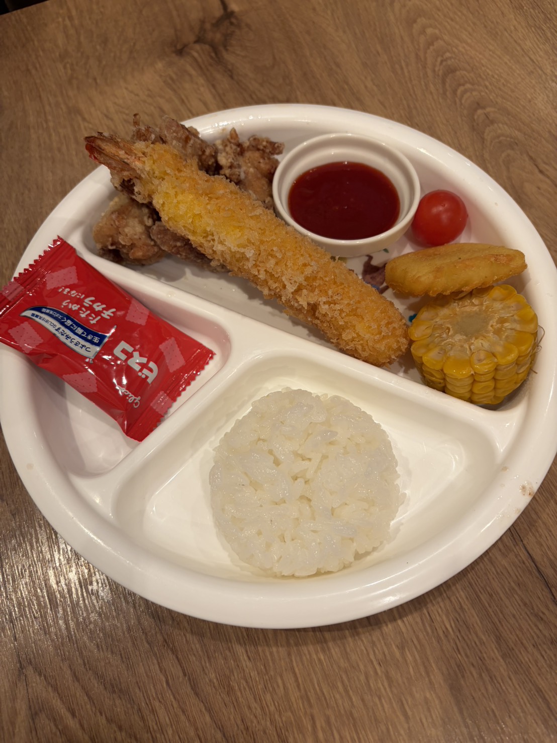 今回は、ハンバーグ&鶏のから揚げ定食、チキン南蛮定食、お子様からあげ&えびフライを注文。(お子様メニューはふりかけとジュース付きです)