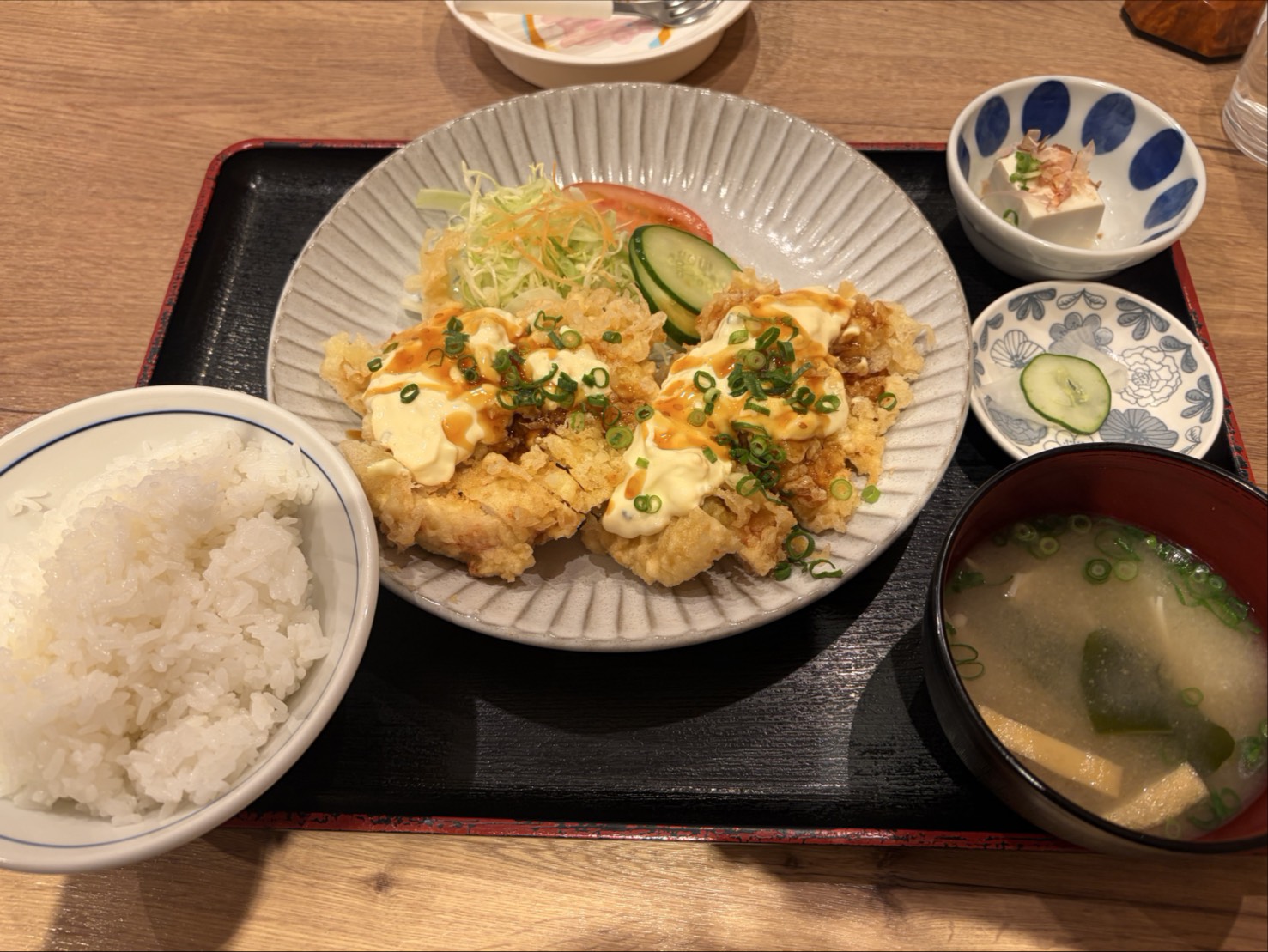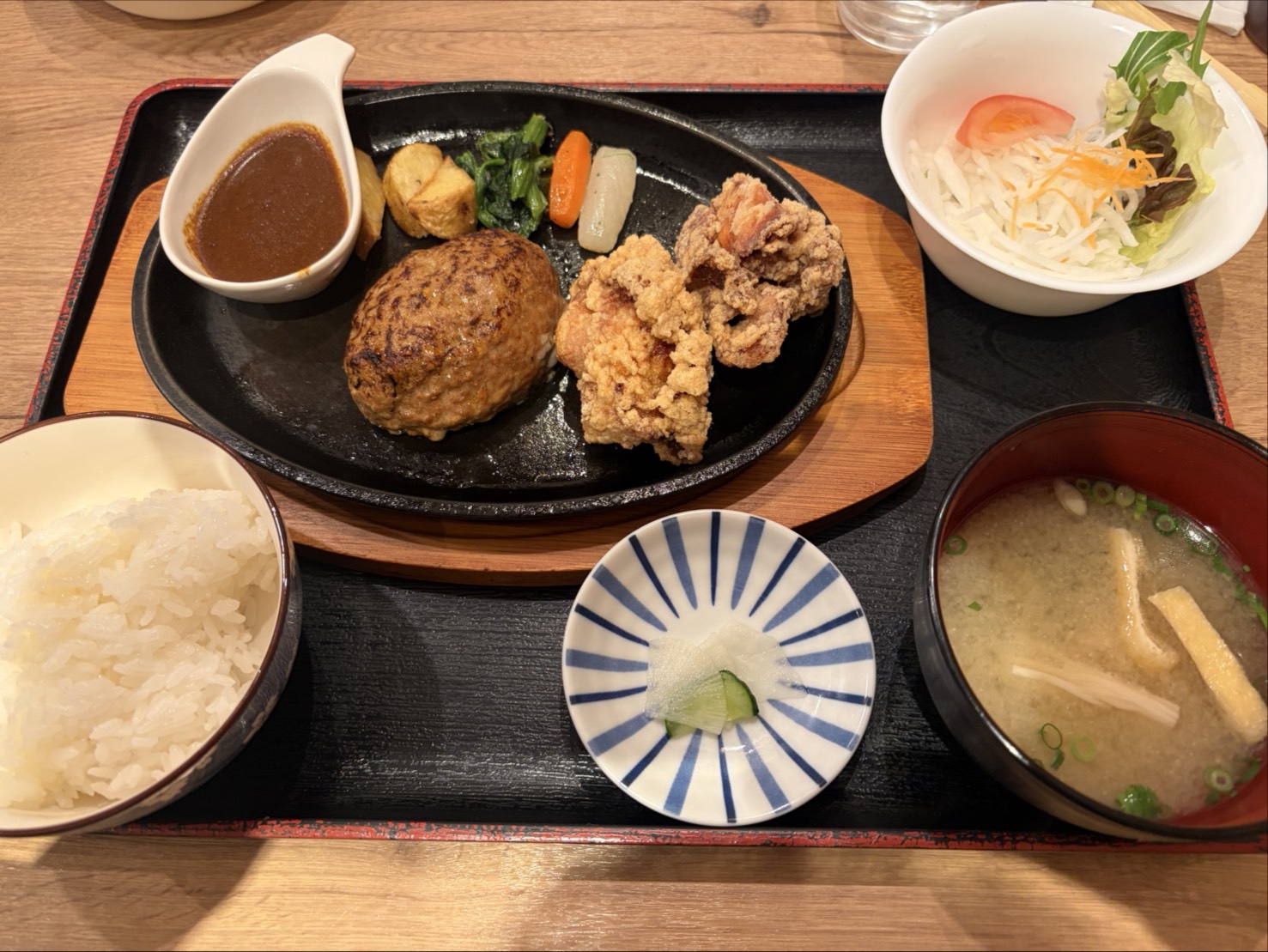 ハンバーグが小ぶりのように見えますが、唐揚げが大きくてパリパリの皮が美味しかったです。