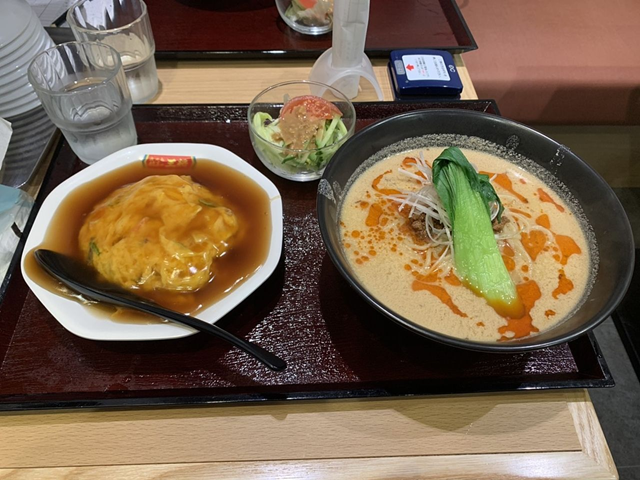 外が寒かったので温かいものが食べたいな思い、半天津飯麺セットの極担々麺を注文!!
