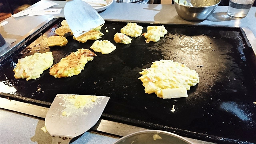 お好み焼きは作りやすいように、ひっくり返しやすいようにミニサイズで作成。