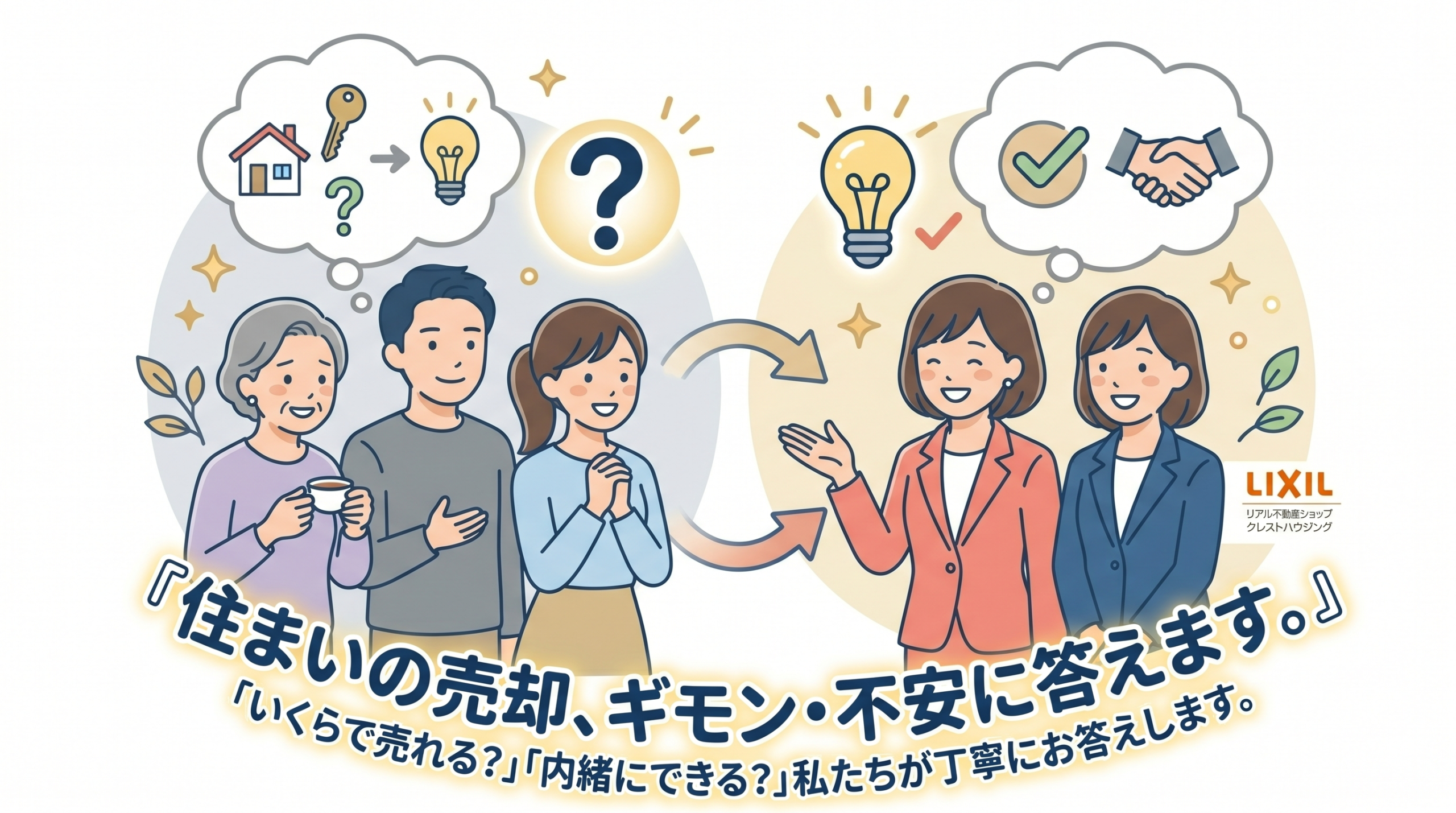 A:そのままの状態で大丈夫です! 「リフォームしてからじゃないと売れないのでは?」と心配される方が多いですが、そのようなことはありません。むしろ、今のままの状態の方が、買主様が「自分ならこう住みたい」とイメージしやすいこともあります。荷物の片付けやクリーニングについても、売却価格に影響しない範囲でプロとして的確なアドバイスをしますので、まずはそのままの状態でご相談ください。